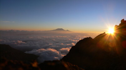 5. Tag: Der Aufbruch zum Mt Meru beginnt nach Mitternacht, damit Sie kurz nach Sonnenaufgang auf dem Gipfel des Mount Meru stehen und nach gut 5 Stunden den Blick über die Savanne genießen können. Über allem thront mächtig der Kilimanjaro, für den Sie sich durch die Besteigung des Mount Meru optimal vorbereitet haben. Abstieg zur bereits bekannten Sattelhütte, 3566 m, wo Sie zur Verbesserung der Akklimatisation eine zweite Nacht verbringen ca. (8h).