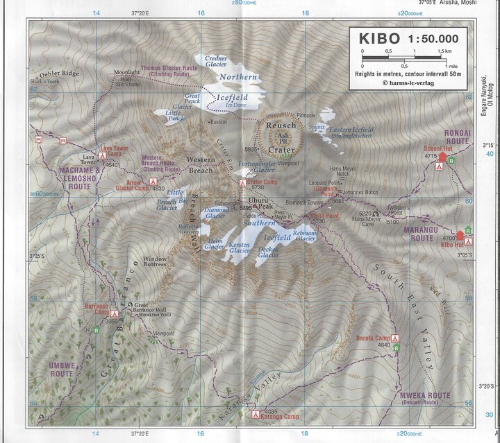 Die „Thomas-Glacier-Route" führt über weite Teile durch wegloses Gelände. Aufgrund der Länge der Route und der Wegführung ist der konditionsstarke „Westalpen-Bergsteiger" gefordert. Die Schwierigkeiten im Eis entsprechen einer einfachen Gletschertour. Nur vom Eisrand in den Krater muss über eine ca. 10 m hohe Eiswand in den Hauptkrater abgeseilt werden. Während des Trekkings ist Ihr Tagesgepäck selbst zu tragen, das große Gepäck wird von Trägern transportiert.